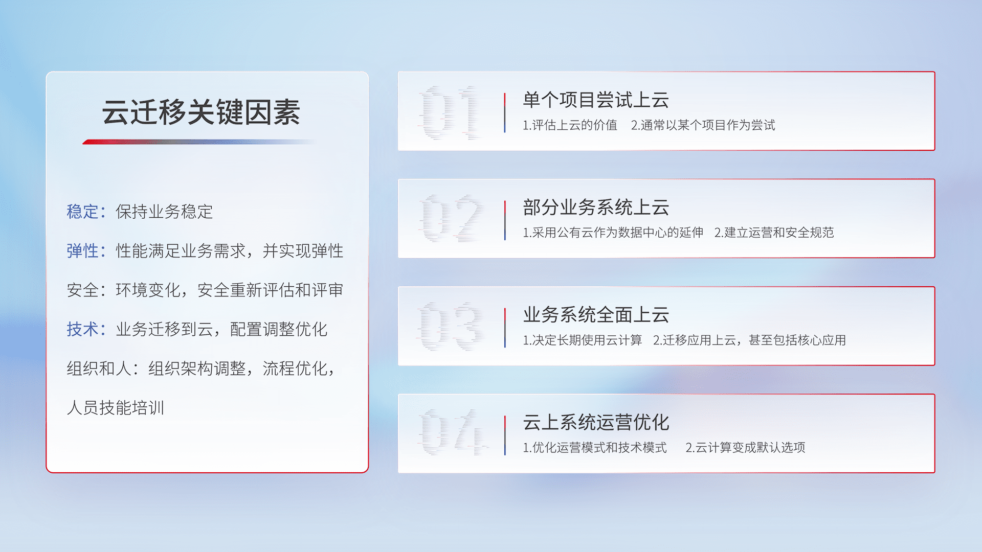 结合实际业务,,,,从规划设计、、云平台选型、、云原生改造、、、、数据迁移、、、、集成交付,,,迁移全过程为客户识别最佳上云路径,,,做好风险识别管理,,设计网络架构、、、身份权限、、、安全审计合规、、、操作审计、、、日志审计、、监控告警策略、、、、多站点容灾设计等,,,对云上基础设施进行整体规划,,,提升IT治理水平,,,以满足弹性、、、高可用、、、、高性能的需求。。。