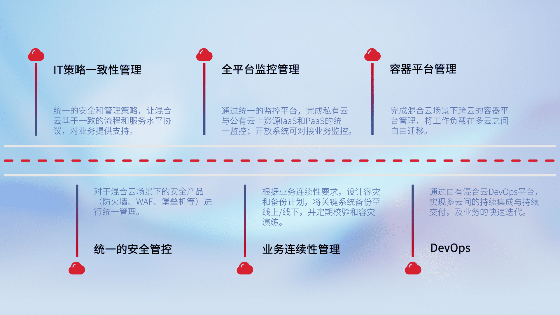 通过多云纳管,,,,以统一的资源数据模型把客户的云资源进行抽象和封装,,进而实现对多云资源的统一操作,,,,保障云资源管理的可靠性、、稳定性与可用性。。。。量身定制化运维内容,,,配置、、、、开发运维、、、补丁管理、、备份、、、、监控、、、认证和访问管理、、审计和日常巡检等,,保障在用云过程中的可靠度,,,,稳定度以及高可用率。。。。
